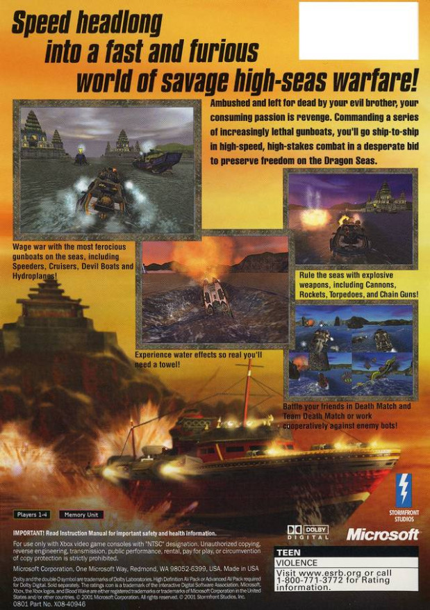 Blood Wake is a naval combat video game that was released in 2001 on the Xbox as part of Microsoft's initial wave of Xbox launch titles. The game was developed by Stormfront Studios and published by Microsoft Game Studios. Set in an Asian themed fictional world, Blood Wake is a story driven, mission based high seas action game in which the player controls a series of small fighting vessels. Some reviewers described its gameplay as "Twisted Metal on water," although its mission-based story line differentiated Blood Wake from Twisted Metal's arena based gameplay. The player controls Lieutenant Shao Kai, a former naval officer of the Northern League fleet who was betrayed and left for dead by his brother, Admiral Shao Lung. Kai is rescued by a band of sea raiders known as the Shadow Clan, and joins them after proving himself worthy to their leader, Ped Zeng. He will bide his time with them awaiting his chance for revenge against his brother. Here he meets a formidable young woman who advises Ped and becomes the love interest. The Shadow Clan spends most of its time preying on the third faction in the game, the Jade Kingdom, who are primarily a mercantile power led by Lord Sri Brana. All are now in the path of Admiral Shao Lung's ambitions to create the Iron Empire. Lung has developed a monstrous warship named the Dragon and a powerful magic amulet to defeat anyone and anything in his way.